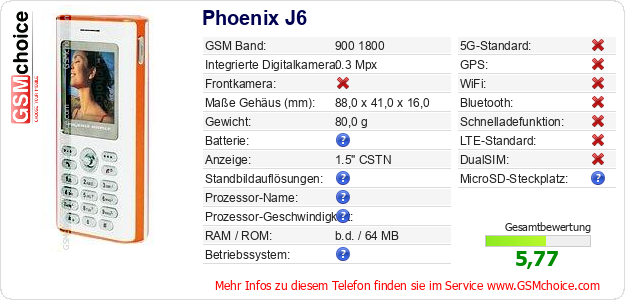 Hast du eigene Webseite? Willst du die Informationen über Standarddaten des Handys Phoenix J6 irgendwo veröffentlichen? Das ist sehr einfach. Du kannst das Bild herunterladen oder kopieren und auf der Webseite folgenden Code hinzufügen:Das Einfügen von diesem Code verursacht das Anzeigen von dem folgenden Bild: