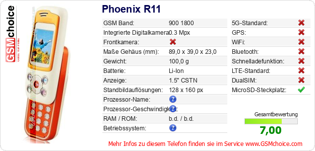 Hast du eigene Webseite? Willst du die Informationen über Standarddaten des Handys Phoenix R11 irgendwo veröffentlichen? Das ist sehr einfach. Du kannst das Bild herunterladen oder kopieren und auf der Webseite folgenden Code hinzufügen:Das Einfügen von diesem Code verursacht das Anzeigen von dem folgenden Bild: