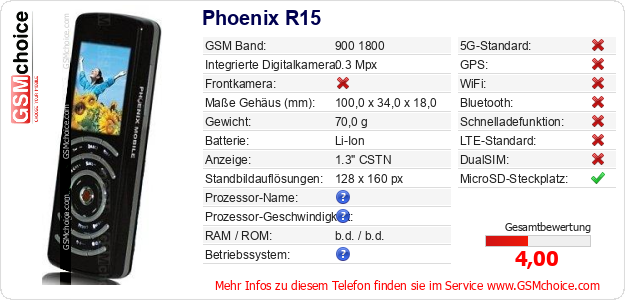 Hast du eigene Webseite? Willst du die Informationen über Standarddaten des Handys Phoenix R15 irgendwo veröffentlichen? Das ist sehr einfach. Du kannst das Bild herunterladen oder kopieren und auf der Webseite folgenden Code hinzufügen:Das Einfügen von diesem Code verursacht das Anzeigen von dem folgenden Bild: