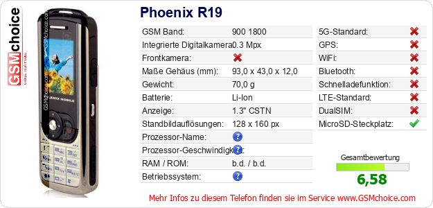 Hast du eigene Webseite? Willst du die Informationen über Standarddaten des Handys Phoenix R19 irgendwo veröffentlichen? Das ist sehr einfach. Du kannst das Bild herunterladen oder kopieren und auf der Webseite folgenden Code hinzufügen:Das Einfügen von diesem Code verursacht das Anzeigen von dem folgenden Bild: