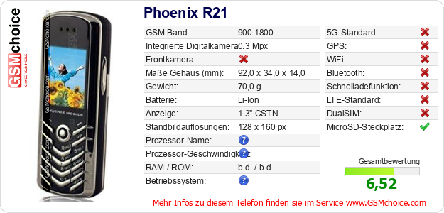 Hast du eigene Webseite? Willst du die Informationen über Standarddaten des Handys Phoenix R21 irgendwo veröffentlichen? Das ist sehr einfach. Du kannst das Bild herunterladen oder kopieren und auf der Webseite folgenden Code hinzufügen:Das Einfügen von diesem Code verursacht das Anzeigen von dem folgenden Bild:
