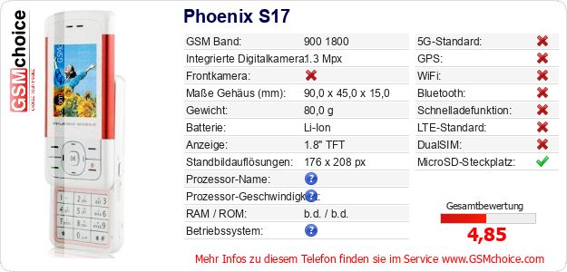 Hast du eigene Webseite? Willst du die Informationen über Standarddaten des Handys Phoenix S17 irgendwo veröffentlichen? Das ist sehr einfach. Du kannst das Bild herunterladen oder kopieren und auf der Webseite folgenden Code hinzufügen:Das Einfügen von diesem Code verursacht das Anzeigen von dem folgenden Bild: