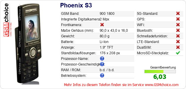 Hast du eigene Webseite? Willst du die Informationen über Standarddaten des Handys Phoenix S3 irgendwo veröffentlichen? Das ist sehr einfach. Du kannst das Bild herunterladen oder kopieren und auf der Webseite folgenden Code hinzufügen:Das Einfügen von diesem Code verursacht das Anzeigen von dem folgenden Bild: