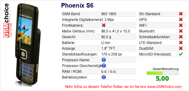 Hast du eigene Webseite? Willst du die Informationen über Standarddaten des Handys Phoenix S6 irgendwo veröffentlichen? Das ist sehr einfach. Du kannst das Bild herunterladen oder kopieren und auf der Webseite folgenden Code hinzufügen:Das Einfügen von diesem Code verursacht das Anzeigen von dem folgenden Bild: