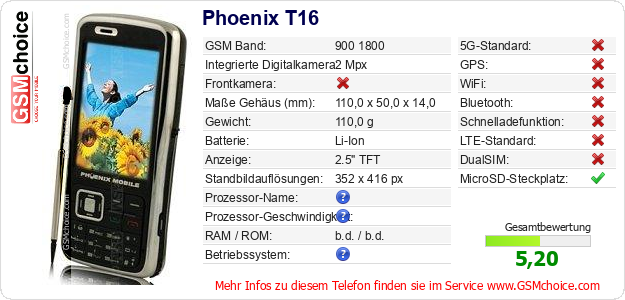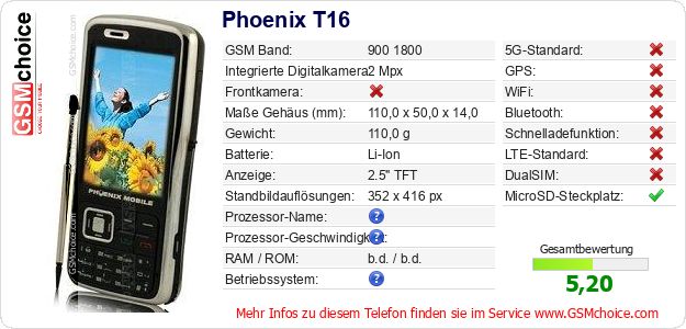 Hast du eigene Webseite? Willst du die Informationen über Standarddaten des Handys Phoenix T16 irgendwo veröffentlichen? Das ist sehr einfach. Du kannst das Bild herunterladen oder kopieren und auf der Webseite folgenden Code hinzufügen:Das Einfügen von diesem Code verursacht das Anzeigen von dem folgenden Bild:
