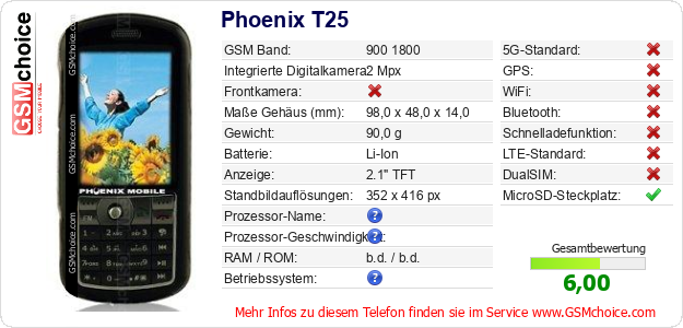 Hast du eigene Webseite? Willst du die Informationen über Standarddaten des Handys Phoenix T25 irgendwo veröffentlichen? Das ist sehr einfach. Du kannst das Bild herunterladen oder kopieren und auf der Webseite folgenden Code hinzufügen:Das Einfügen von diesem Code verursacht das Anzeigen von dem folgenden Bild:
