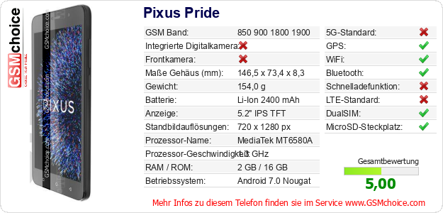 Hast du eigene Webseite? Willst du die Informationen über Standarddaten des Handys Pixus Pride irgendwo veröffentlichen? Das ist sehr einfach. Du kannst das Bild herunterladen oder kopieren und auf der Webseite folgenden Code hinzufügen:Das Einfügen von diesem Code verursacht das Anzeigen von dem folgenden Bild: