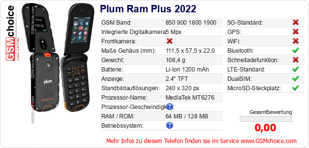 Hast du eigene Webseite? Willst du die Informationen über Standarddaten des Handys Plum Ram Plus 2022 irgendwo veröffentlichen? Das ist sehr einfach. Du kannst das Bild herunterladen oder kopieren und auf der Webseite folgenden Code hinzufügen:Das Einfügen von diesem Code verursacht das Anzeigen von dem folgenden Bild: