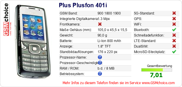 Hast du eigene Webseite? Willst du die Informationen über Standarddaten des Handys Plus Plusfon 401i irgendwo veröffentlichen? Das ist sehr einfach. Du kannst das Bild herunterladen oder kopieren und auf der Webseite folgenden Code hinzufügen:Das Einfügen von diesem Code verursacht das Anzeigen von dem folgenden Bild: