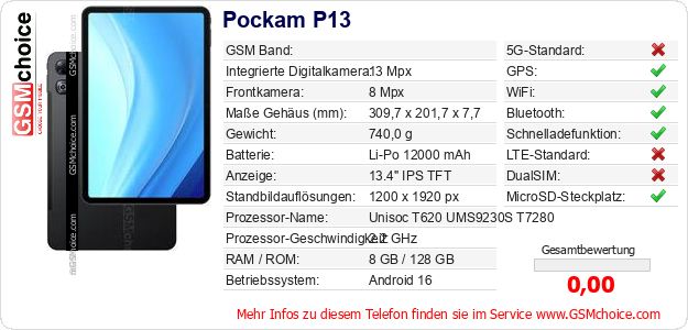 Hast du eigene Webseite? Willst du die Informationen über Standarddaten des Handys Pockam P13 irgendwo veröffentlichen? Das ist sehr einfach. Du kannst das Bild herunterladen oder kopieren und auf der Webseite folgenden Code hinzufügen:Das Einfügen von diesem Code verursacht das Anzeigen von dem folgenden Bild: