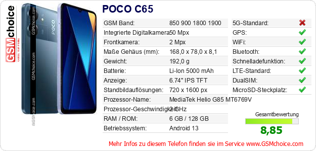 Hast du eigene Webseite? Willst du die Informationen über Standarddaten des Handys POCO C65 irgendwo veröffentlichen? Das ist sehr einfach. Du kannst das Bild herunterladen oder kopieren und auf der Webseite folgenden Code hinzufügen:Das Einfügen von diesem Code verursacht das Anzeigen von dem folgenden Bild: