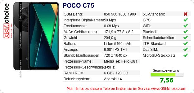 Hast du eigene Webseite? Willst du die Informationen über Standarddaten des Handys POCO C75 irgendwo veröffentlichen? Das ist sehr einfach. Du kannst das Bild herunterladen oder kopieren und auf der Webseite folgenden Code hinzufügen:Das Einfügen von diesem Code verursacht das Anzeigen von dem folgenden Bild: