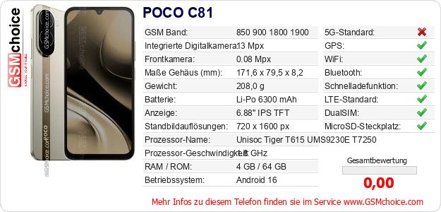 Hast du eigene Webseite? Willst du die Informationen über Standarddaten des Handys POCO C81 irgendwo veröffentlichen? Das ist sehr einfach. Du kannst das Bild herunterladen oder kopieren und auf der Webseite folgenden Code hinzufügen:Das Einfügen von diesem Code verursacht das Anzeigen von dem folgenden Bild: