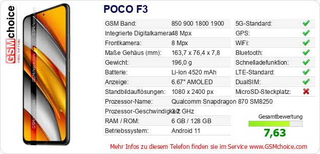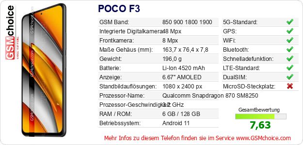 Hast du eigene Webseite? Willst du die Informationen über Standarddaten des Handys POCO F3 irgendwo veröffentlichen? Das ist sehr einfach. Du kannst das Bild herunterladen oder kopieren und auf der Webseite folgenden Code hinzufügen:Das Einfügen von diesem Code verursacht das Anzeigen von dem folgenden Bild: