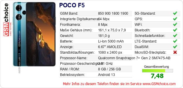 Hast du eigene Webseite? Willst du die Informationen über Standarddaten des Handys POCO F5 irgendwo veröffentlichen? Das ist sehr einfach. Du kannst das Bild herunterladen oder kopieren und auf der Webseite folgenden Code hinzufügen:Das Einfügen von diesem Code verursacht das Anzeigen von dem folgenden Bild: