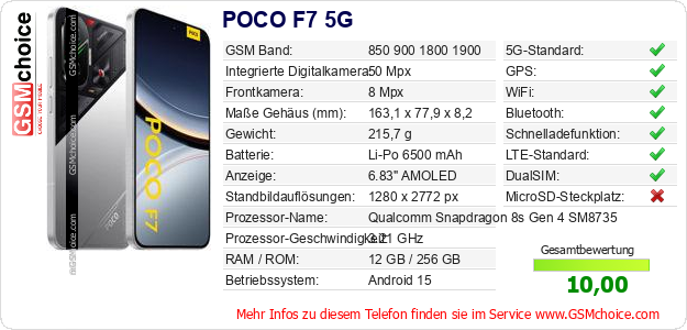Hast du eigene Webseite? Willst du die Informationen über Standarddaten des Handys POCO F7 5G irgendwo veröffentlichen? Das ist sehr einfach. Du kannst das Bild herunterladen oder kopieren und auf der Webseite folgenden Code hinzufügen:Das Einfügen von diesem Code verursacht das Anzeigen von dem folgenden Bild: