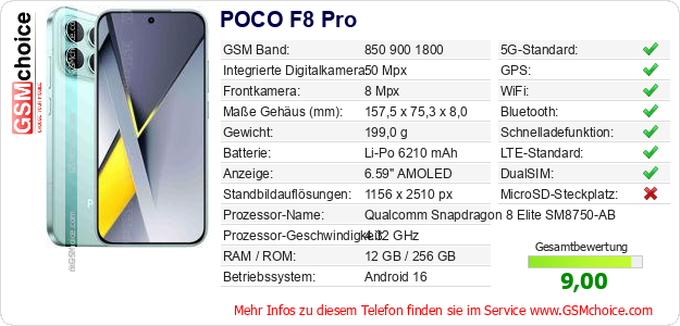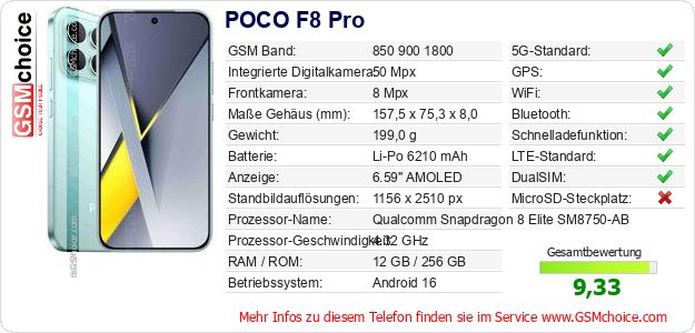 Hast du eigene Webseite? Willst du die Informationen über Standarddaten des Handys POCO F8 Pro irgendwo veröffentlichen? Das ist sehr einfach. Du kannst das Bild herunterladen oder kopieren und auf der Webseite folgenden Code hinzufügen:Das Einfügen von diesem Code verursacht das Anzeigen von dem folgenden Bild: