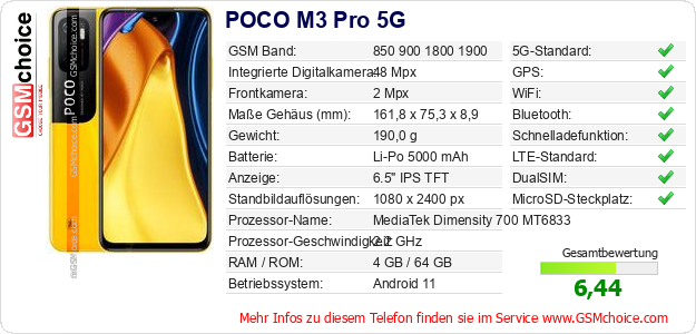 Hast du eigene Webseite? Willst du die Informationen über Standarddaten des Handys POCO M3 Pro 5G irgendwo veröffentlichen? Das ist sehr einfach. Du kannst das Bild herunterladen oder kopieren und auf der Webseite folgenden Code hinzufügen:Das Einfügen von diesem Code verursacht das Anzeigen von dem folgenden Bild:
