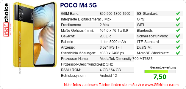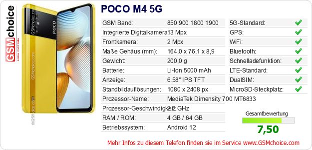 Hast du eigene Webseite? Willst du die Informationen über Standarddaten des Handys POCO M4 5G irgendwo veröffentlichen? Das ist sehr einfach. Du kannst das Bild herunterladen oder kopieren und auf der Webseite folgenden Code hinzufügen:Das Einfügen von diesem Code verursacht das Anzeigen von dem folgenden Bild: