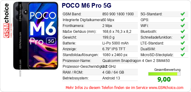 Hast du eigene Webseite? Willst du die Informationen über Standarddaten des Handys POCO M6 Pro 5G irgendwo veröffentlichen? Das ist sehr einfach. Du kannst das Bild herunterladen oder kopieren und auf der Webseite folgenden Code hinzufügen:Das Einfügen von diesem Code verursacht das Anzeigen von dem folgenden Bild: