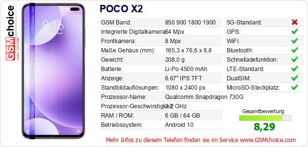 Hast du eigene Webseite? Willst du die Informationen über Standarddaten des Handys POCO X2 irgendwo veröffentlichen? Das ist sehr einfach. Du kannst das Bild herunterladen oder kopieren und auf der Webseite folgenden Code hinzufügen:Das Einfügen von diesem Code verursacht das Anzeigen von dem folgenden Bild: