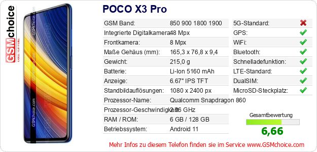Hast du eigene Webseite? Willst du die Informationen über Standarddaten des Handys POCO X3 Pro irgendwo veröffentlichen? Das ist sehr einfach. Du kannst das Bild herunterladen oder kopieren und auf der Webseite folgenden Code hinzufügen:Das Einfügen von diesem Code verursacht das Anzeigen von dem folgenden Bild: