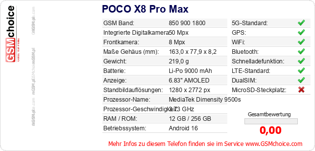 Daten des Mobiltelefons POCO X8 Pro Max auf Ihrer Seite
