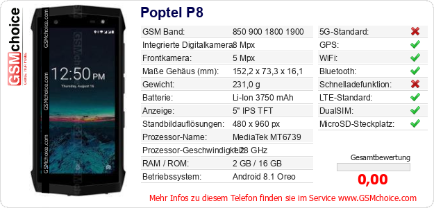 Hast du eigene Webseite? Willst du die Informationen über Standarddaten des Handys Poptel P8 irgendwo veröffentlichen? Das ist sehr einfach. Du kannst das Bild herunterladen oder kopieren und auf der Webseite folgenden Code hinzufügen:Das Einfügen von diesem Code verursacht das Anzeigen von dem folgenden Bild: