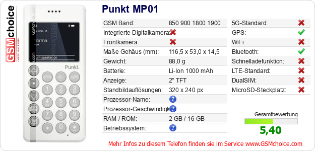 Hast du eigene Webseite? Willst du die Informationen über Standarddaten des Handys Punkt MP01 irgendwo veröffentlichen? Das ist sehr einfach. Du kannst das Bild herunterladen oder kopieren und auf der Webseite folgenden Code hinzufügen:Das Einfügen von diesem Code verursacht das Anzeigen von dem folgenden Bild: