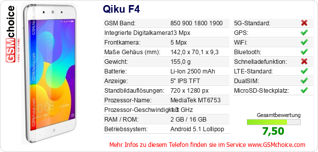 Hast du eigene Webseite? Willst du die Informationen über Standarddaten des Handys Qiku F4 irgendwo veröffentlichen? Das ist sehr einfach. Du kannst das Bild herunterladen oder kopieren und auf der Webseite folgenden Code hinzufügen:Das Einfügen von diesem Code verursacht das Anzeigen von dem folgenden Bild:
