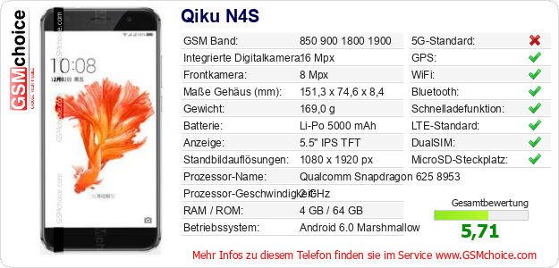 Hast du eigene Webseite? Willst du die Informationen über Standarddaten des Handys Qiku N4S irgendwo veröffentlichen? Das ist sehr einfach. Du kannst das Bild herunterladen oder kopieren und auf der Webseite folgenden Code hinzufügen:Das Einfügen von diesem Code verursacht das Anzeigen von dem folgenden Bild: