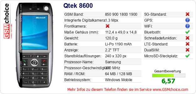 Hast du eigene Webseite? Willst du die Informationen über Standarddaten des Handys Qtek 8600 irgendwo veröffentlichen? Das ist sehr einfach. Du kannst das Bild herunterladen oder kopieren und auf der Webseite folgenden Code hinzufügen:Das Einfügen von diesem Code verursacht das Anzeigen von dem folgenden Bild: