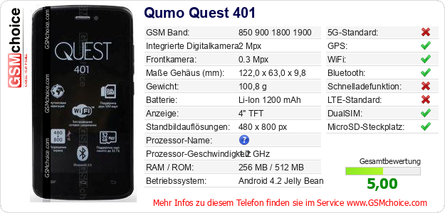 Hast du eigene Webseite? Willst du die Informationen über Standarddaten des Handys Qumo Quest 401 irgendwo veröffentlichen? Das ist sehr einfach. Du kannst das Bild herunterladen oder kopieren und auf der Webseite folgenden Code hinzufügen:Das Einfügen von diesem Code verursacht das Anzeigen von dem folgenden Bild: