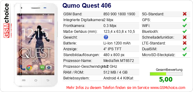 Hast du eigene Webseite? Willst du die Informationen über Standarddaten des Handys Qumo Quest 406 irgendwo veröffentlichen? Das ist sehr einfach. Du kannst das Bild herunterladen oder kopieren und auf der Webseite folgenden Code hinzufügen:Das Einfügen von diesem Code verursacht das Anzeigen von dem folgenden Bild: