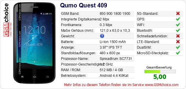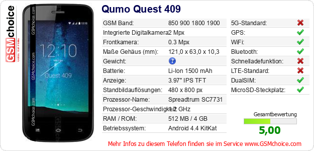 Hast du eigene Webseite? Willst du die Informationen über Standarddaten des Handys Qumo Quest 409 irgendwo veröffentlichen? Das ist sehr einfach. Du kannst das Bild herunterladen oder kopieren und auf der Webseite folgenden Code hinzufügen:Das Einfügen von diesem Code verursacht das Anzeigen von dem folgenden Bild: