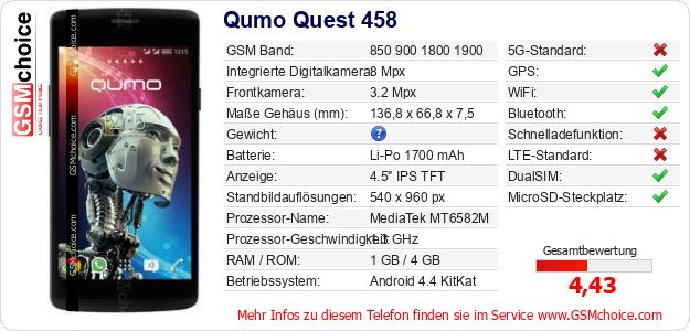 Hast du eigene Webseite? Willst du die Informationen über Standarddaten des Handys Qumo Quest 458 irgendwo veröffentlichen? Das ist sehr einfach. Du kannst das Bild herunterladen oder kopieren und auf der Webseite folgenden Code hinzufügen:Das Einfügen von diesem Code verursacht das Anzeigen von dem folgenden Bild: