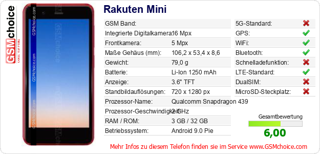 Hast du eigene Webseite? Willst du die Informationen über Standarddaten des Handys Rakuten Mini irgendwo veröffentlichen? Das ist sehr einfach. Du kannst das Bild herunterladen oder kopieren und auf der Webseite folgenden Code hinzufügen:Das Einfügen von diesem Code verursacht das Anzeigen von dem folgenden Bild: