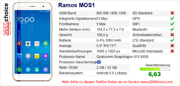Hast du eigene Webseite? Willst du die Informationen über Standarddaten des Handys Ramos MOS1 irgendwo veröffentlichen? Das ist sehr einfach. Du kannst das Bild herunterladen oder kopieren und auf der Webseite folgenden Code hinzufügen:Das Einfügen von diesem Code verursacht das Anzeigen von dem folgenden Bild: