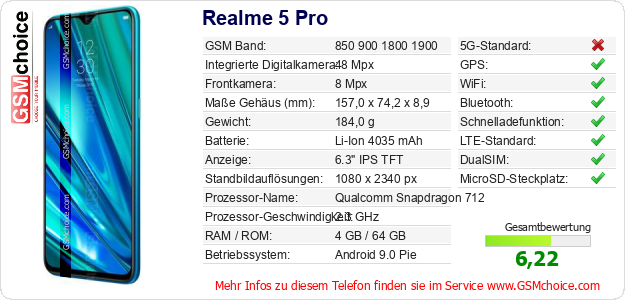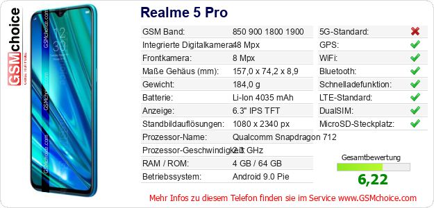 Hast du eigene Webseite? Willst du die Informationen über Standarddaten des Handys Realme 5 Pro irgendwo veröffentlichen? Das ist sehr einfach. Du kannst das Bild herunterladen oder kopieren und auf der Webseite folgenden Code hinzufügen:Das Einfügen von diesem Code verursacht das Anzeigen von dem folgenden Bild:
