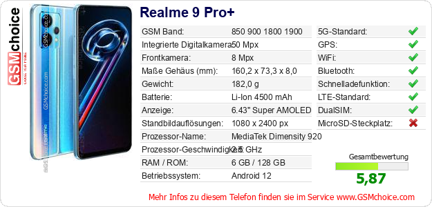 Hast du eigene Webseite? Willst du die Informationen über Standarddaten des Handys Realme 9 Pro+ irgendwo veröffentlichen? Das ist sehr einfach. Du kannst das Bild herunterladen oder kopieren und auf der Webseite folgenden Code hinzufügen:Das Einfügen von diesem Code verursacht das Anzeigen von dem folgenden Bild: