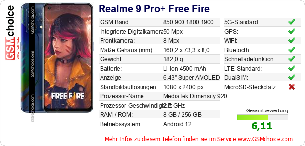 Hast du eigene Webseite? Willst du die Informationen über Standarddaten des Handys Realme 9 Pro+ Free Fire irgendwo veröffentlichen? Das ist sehr einfach. Du kannst das Bild herunterladen oder kopieren und auf der Webseite folgenden Code hinzufügen:Das Einfügen von diesem Code verursacht das Anzeigen von dem folgenden Bild: