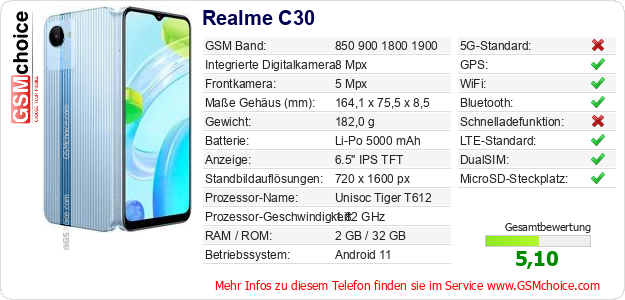 Hast du eigene Webseite? Willst du die Informationen über Standarddaten des Handys Realme C30 irgendwo veröffentlichen? Das ist sehr einfach. Du kannst das Bild herunterladen oder kopieren und auf der Webseite folgenden Code hinzufügen:Das Einfügen von diesem Code verursacht das Anzeigen von dem folgenden Bild: