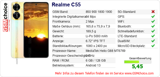 Hast du eigene Webseite? Willst du die Informationen über Standarddaten des Handys Realme C55 irgendwo veröffentlichen? Das ist sehr einfach. Du kannst das Bild herunterladen oder kopieren und auf der Webseite folgenden Code hinzufügen:Das Einfügen von diesem Code verursacht das Anzeigen von dem folgenden Bild: