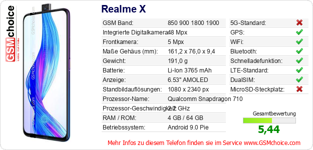 Hast du eigene Webseite? Willst du die Informationen über Standarddaten des Handys Realme X irgendwo veröffentlichen? Das ist sehr einfach. Du kannst das Bild herunterladen oder kopieren und auf der Webseite folgenden Code hinzufügen:Das Einfügen von diesem Code verursacht das Anzeigen von dem folgenden Bild:
