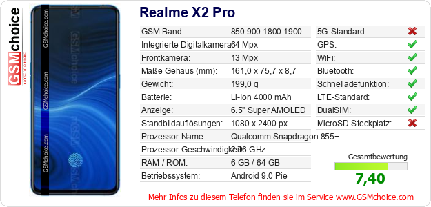 Hast du eigene Webseite? Willst du die Informationen über Standarddaten des Handys Realme X2 Pro irgendwo veröffentlichen? Das ist sehr einfach. Du kannst das Bild herunterladen oder kopieren und auf der Webseite folgenden Code hinzufügen:Das Einfügen von diesem Code verursacht das Anzeigen von dem folgenden Bild: