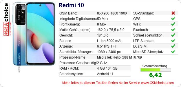 Hast du eigene Webseite? Willst du die Informationen über Standarddaten des Handys Redmi 10 irgendwo veröffentlichen? Das ist sehr einfach. Du kannst das Bild herunterladen oder kopieren und auf der Webseite folgenden Code hinzufügen:Das Einfügen von diesem Code verursacht das Anzeigen von dem folgenden Bild: