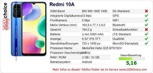 Hast du eigene Webseite? Willst du die Informationen über Standarddaten des Handys Redmi 10A irgendwo veröffentlichen? Das ist sehr einfach. Du kannst das Bild herunterladen oder kopieren und auf der Webseite folgenden Code hinzufügen:Das Einfügen von diesem Code verursacht das Anzeigen von dem folgenden Bild: