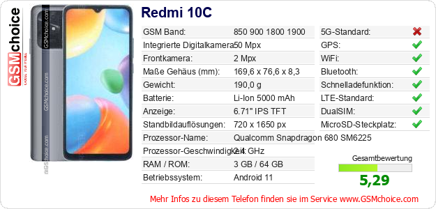 Hast du eigene Webseite? Willst du die Informationen über Standarddaten des Handys Redmi 10C irgendwo veröffentlichen? Das ist sehr einfach. Du kannst das Bild herunterladen oder kopieren und auf der Webseite folgenden Code hinzufügen:Das Einfügen von diesem Code verursacht das Anzeigen von dem folgenden Bild: