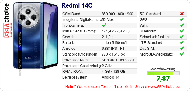 Hast du eigene Webseite? Willst du die Informationen über Standarddaten des Handys Redmi 14C irgendwo veröffentlichen? Das ist sehr einfach. Du kannst das Bild herunterladen oder kopieren und auf der Webseite folgenden Code hinzufügen:Das Einfügen von diesem Code verursacht das Anzeigen von dem folgenden Bild: