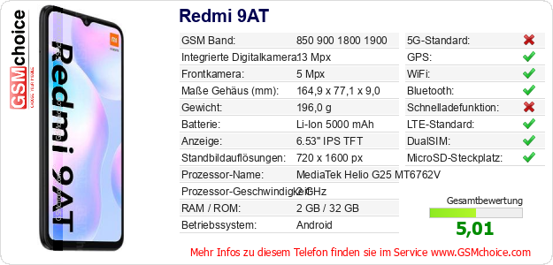 Hast du eigene Webseite? Willst du die Informationen über Standarddaten des Handys Redmi 9AT irgendwo veröffentlichen? Das ist sehr einfach. Du kannst das Bild herunterladen oder kopieren und auf der Webseite folgenden Code hinzufügen:Das Einfügen von diesem Code verursacht das Anzeigen von dem folgenden Bild: